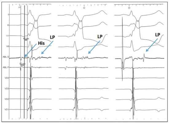 Abnormal late potentials in sinus rhythm. Three examples of fractionated, late potentials (beyond the terminal surface ECG QRS, LP). Note the His bundle deflection in the tracing on the left side. These are electrograms indicating a candidate arrhythmogenic isthmus (see text).