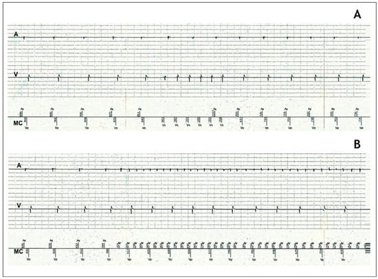 Electrograms from the pacemaker memory. A: Nonsustained ventricular tachycardia (6 complexes, 160–180 bpm). B: Beginning of the episode of atrial arrhythmia. A = atrial electrogram; V = ventricular electrogram; MC = marker channel.