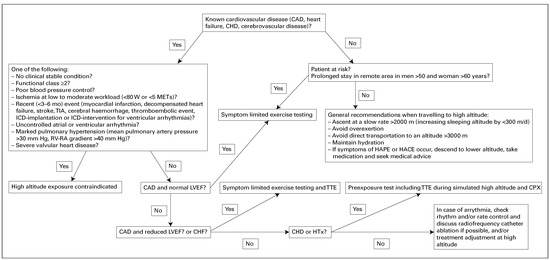 As a result of ease of travel, a rising number of individuals, including many patients with pre-existing cardiovascular disease, visit high-altitude locations (>2500 m). Exposure to high altitude triggers a series of physiological responses intended to maintain adequate tissue oxygenation. Even in healthy subjects, there is enormous interindividual variability in these responses, which may be further amplified by environmental factors. These adaptive mechanisms may cause major problems in patients with pre-existing cardiovascular disease who are not able to compensate for such physiological changes. Pre-exposure assessment of patients helps to reduce risk and detect contraindications to high-altitude exposure. The great variability and unpredictability of the adaptive response should encourage physicians counselling such patients to adopt a cautious approach. Here, we briefly review how high-altitude adjustments may interfere with and aggravate/decompensate pre-existing cardiovascular diseases. Moreover, we provide practical recommendations on how to investigate and counsel patients with cardiovascular disease desiring to travel to high-altitude locations. Full article