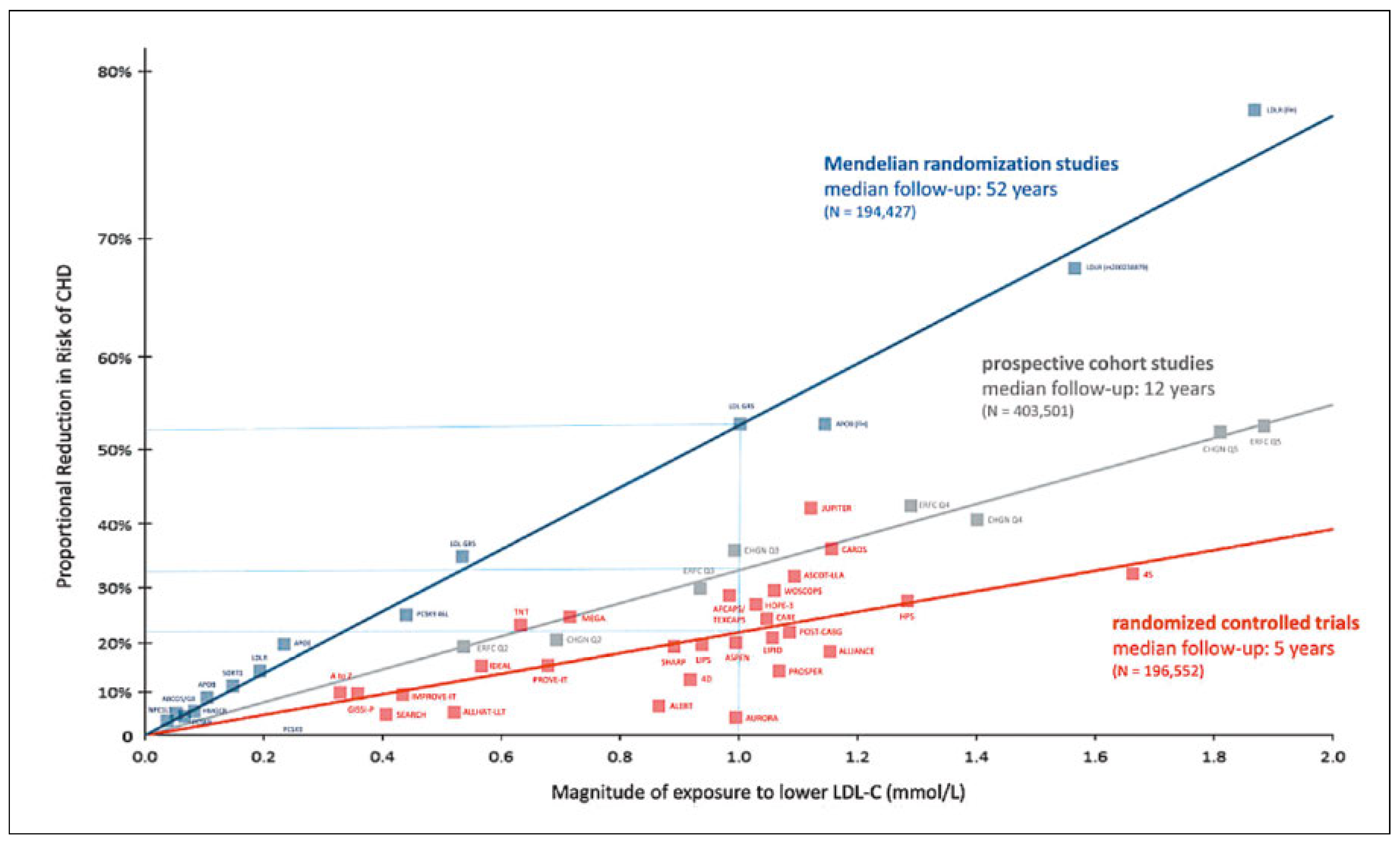- in Mendellian Randomization Studies genetisch tiefe bzw. hohe LDL-Cholesterinwerte mit einer tiefen bzw. hohen Rate an Herzinfarkt und Tod einhergehen;