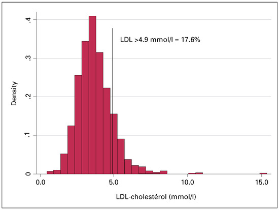 Valeurs de LDL-cholestérol chez les hommes de moins de 55 ans et femmes de moins de 60 ans se présentant avec un syndrome coronarien aigu en Suisse (n = 1585) (adapté de [19]).