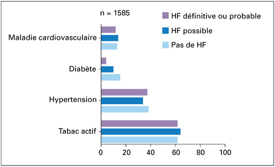 Présence de facteurs de risque cardiovasculaire chez les hommes de moins de 60 ans et les femmes de moins de 55 ans se présentant avec un syndrome coronarien en Suisse, avec ou sans critères cliniques d’hypercholestérolémie familiale (HF) (adapté de [19]).