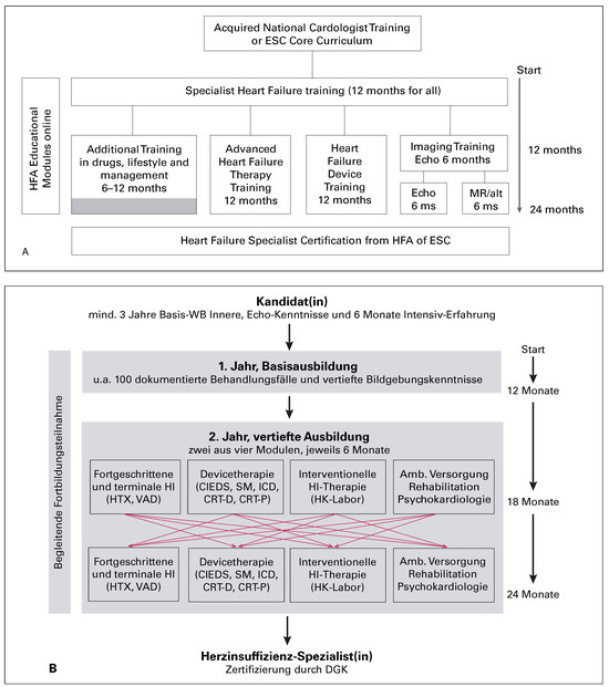 (A) stellt das HI-Spezialisten- Curriculum der HFA dar [6], die (B) jenes der AG Herzinsuffizienz der DGK [18]. Nachdruck mit freundlicher Genehmigung von Prof. Theresa McDonagh (für (A)) und Prof. Norbert Frey (für (B)). CIEDS = Cardiovascular implantable electronic devices.