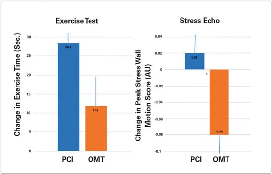 Am Ende der Beobachtungsperiode nahmen zwei Drittel der Patienten, die einen Stent erhalten hatten, drei oder mehr Antiangiosa ein, während dies bei in der Plazebo-Gruppe bei drei Vierteln der Patienten der Fall war. 39% der gestenteten Patienten und 29% der nur medikamentös behandelten Patienten hatten nach sechs Wochen keinerlei Angina, weitere 13 bzw. 20% CCS1 und ein Drittel der Patienten in beiden Gruppen CCS2. Die Verbesserung der gesamten Belastungszeit bis zum Auftreten von Angina betrug in der PCIGruppe 28.4 Sek. und in der Plazebogruppe 11.8 Sek., ein deutlicher Unterschied, der aber aufgrund der statistischen Grösse der Gruppen die Signifikanzgrenze nicht erreichte (Figure 2A). Allerdings war in der Stressechokardiographie der «Peak Stress Wall Motion Index Score» der PCI-Gruppe signifikant besser als in der mit Medikamenten behandelten Gruppe (Figure 2B). Somit wurde zwar die objektiv gemessene Ischämie im linken Ventrikel in der PCI-Gruppe verbessert, die Verlängerung der Belastungsdauer durch die Intervention blieb aber statistisch nicht signifikant.