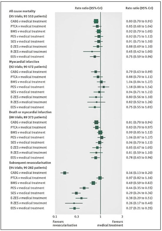 - Windecker, S.; Stortecky, S.; Stefanini, G.G.; da Costa, B.R.; Rutjes, A.W.; Di Nisio, M.; et al. Revascularisation versus medical treatment in patients with stable coronary artery disease: Network meta-analysis. BMJ 2014, 348, 348, g3859. [Google Scholar] [CrossRef] [PubMed]