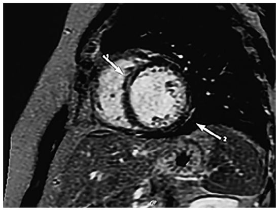 CMR with late gadolinium enhancement in the septum (1) and lateral wall epicardially (2) (marked by arrows).