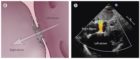 Interatrial shunt device (IASD). A: Device placement in the interatrial septum, arrow indicates right to left atrial blood flow. B: Echocardiographic image showing colour flow from the left to the right atrium. (Reproduced with permission from Hasenfuss et al. 2016 [5]).