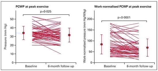 Exercise time increased to 8.2 min ± 3.4 (p = 0.0275) and work load increased to 49 ± 20 W at 6 months after IASD implantation. These favourable changes were associated with a reduction of peak exercise PCWP from 34 ± 8 to 32 ± 8 mm Hg (p = 0.00255) (Figure 2). The reduction in PCWP should be interpreted relative to the increased exercise duration at a higher work load. Consequently, workload- and weight-normalised PCWP (PCWP/W/kg) may most appropriately assess the impact of IASD on exercise performance. Workload- and weight-normalised PCWP at peak exercise was reduced from 84 ± 45 to 69 ± 40 mm Hg/W/kg (p = 0.0001).