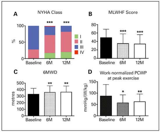 Symptomatic and functional improvement after intra-atrial shunt device (IASD over 12 months). A: NYHA class = New York Heart Association Functional Class; B: MLWHF score = Minnesota Living With Heart Failure Questionnaire; C: 6MWD = 6-minute walking distance; D: Work-normalised PCWP at peak exercise = work- and weight-normalised pulmonary capillary wedge pressure at peak exercise. (Reproduced with permission from Kaye et al. 2016 [8].).