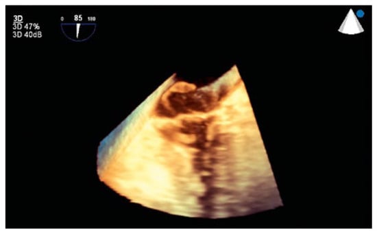 An 88-year-old man with a history of transient ischaemic attack, chronic kidney disease and primary hypertension presented with dyspnoea and was found to have large bilateral pulmonary emboli on a computed-tomography angiogram of the chest. A deep venous thrombosis (DVT) in the left lower extremity involving the popliteal, peroneal and gastrocnemius veins was found on venous duplex ultrasound. A transthoracic echocardiogram showed a thrombus in the right atrium, and a long thrombus in the left atrium extending via the left ventricle through the aortic valve (video 1) (You will find the video files in the multimedia collection of «Cardiovascular Medicine»: https://cardiovascmed.ch/online-only-content). A transoesophageal echocardiogram (TEE) showed a large thrombus entrapped in a patent foramen ovale (PFO) (video 2, Figure 1) with further extension of the same thrombus via the left ventricle through the aortic valve (videos 3 and 4, Figure 2 and Figure 3). Three-dimensional imaging taken during the TEE showed the entrapped thrombus passing through the PFO into the left atrium (Figure 4), and then through the mitral valve into the left ventricle (Figure 5 and Figure 6).