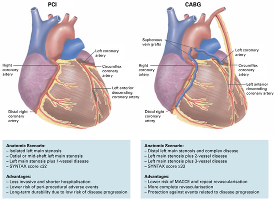Myocardial revascularisation by means of percutaneous coronary intervention (PCI) or coronary artery bypass grafting (CABG) has an established role for the treatment of coronary artery disease. During the past years, the introduction of new-generation drug-eluting stents and improvements pharmacological therapy allowed for an [...] Read more.