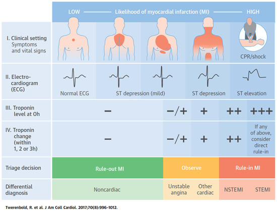 - Reichlin, T.; Hochholzer, W.; Bassetti, S.; Steuer, S.; Stelzig, C.; Hartwiger, S.; et al. Early diagnosis of myocardial infarction with sensitive cardiac troponin assays. N Engl J Med. 2009, 361, 858–867. [Google Scholar] [CrossRef] [PubMed]