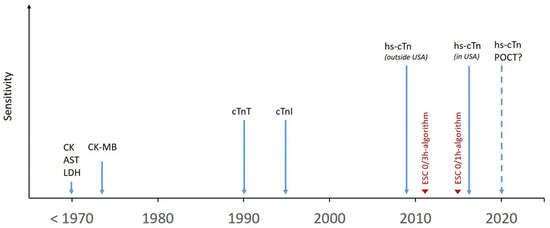 Historical timeline of myocardial necrosis markers. Clinical introduction of myocardial necrosis markers over time and their respective biochemical and analytical sensitivity. AST = aspartate aminotransferase; CK = Creatine kinase; CK-MB = Creatine kinase muscle/brain; cTn = cardiac troponin; ESC = European Society of Cardiology; hs-cTn = high-sensitivity cardiac troponin; LDH = lactate dehydrogenase; POCT = point of care testing.