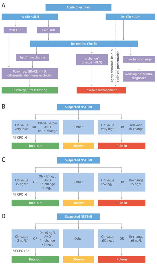 - Twerenbold, R.; Neumann, J.T.; Sörensen, N.A.; Ojeda, F.; Karakas, M.; Boeddinghaus, J.; et al. Prospective Validation of the 0/1-h Algorithm for Early Diagnosis of Myocardial Infarction. J Am Coll Cardiol. 2018, 72, 620–632. [Google Scholar] [CrossRef]