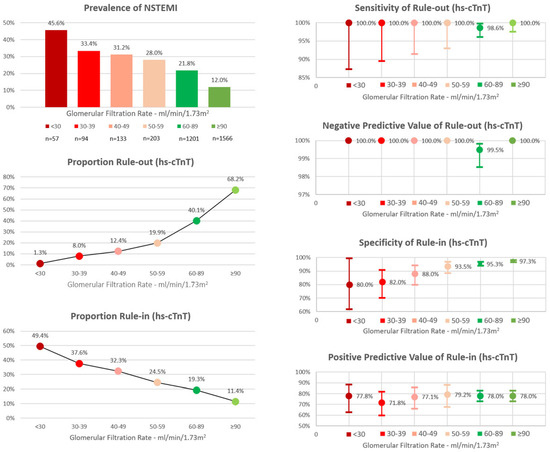 Performance of the European Society of Cardiology 0/1h-algorithm using high-sensitivity cardiac troponin T in different stages of renal function. hs-cTnT = high-sensitivity cardiac troponin T; NSTEMI = Non-ST-Segment-Elevation Myocardial Infarction. Adapted from Twerenbold et al. [60] with permission from the publisher.