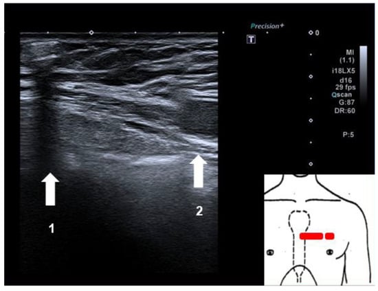 Sonographic check of the device position in relation to the silicone breast implant: 1. Subcutaneous ILR with posterior ultrasound shadow. 2. Medial boarder of left silicone breast implant.