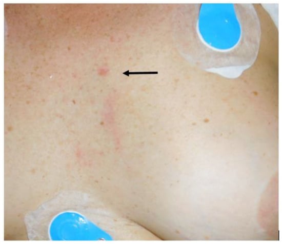 According to the manufacturer of the device used, there are three recommended ways to implant the ILR (Figure 1), the best being number 1 (at 45 degrees to the sternum over the fourth intercostal space, V2–V3 electrode orientation). The superior end of the device is positioned approximately 2 cm (±1 cm) lateral to the left sternal border). Because of the silicone breast implants, we decided to implant in the way listed as option number 2–fourth intercostal space approximately 2 cm (±1 cm) from and parallel to the sternal border. Option number 1, in our eyes, held the bigger risk of puncturing the silicone implant and number 3 may interfere and cause discomfort with a wire support bra.