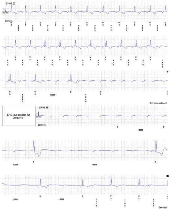 A 54-year-old, otherwise healthy female patient with no regular medication underwent laparoscopic hysterectomy because of postmenopausal bleeding. During the operation a “cardiac rhythm disorder”, which was successfully treated with atropine by the attending anaesthesiologist, was reported. Unfortunately, no further documentation or rhythm strip was available and the nature of the episode remained unclear. The postoperative observation period was uneventful; specifically, no rhythm disorders were found (telemetry rhythm surveillance) and the patient was discharged soon thereafter.