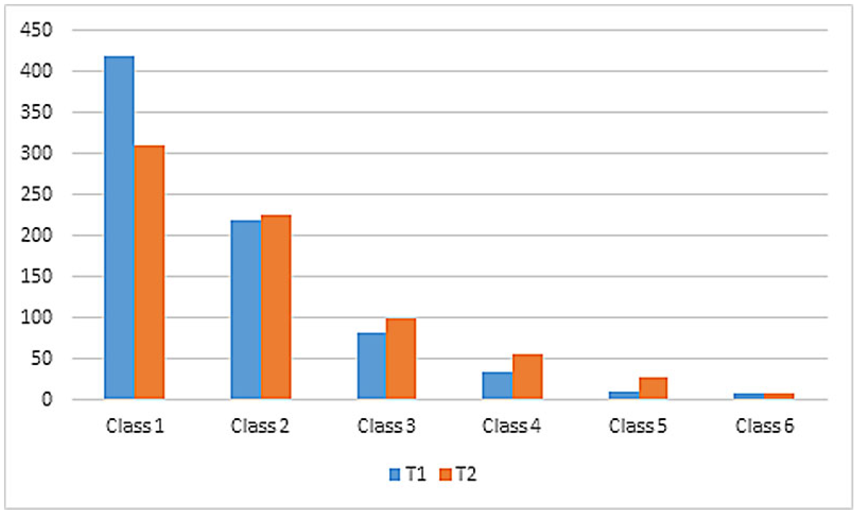 Between T1 and T2, we assessed a switch from GFR class 1 to higher GFR classes according to the KDIGO classification of chronic kidney injury. A total of 418 (54.2%) patients were classified as GFR class 1 at T1 and 310 (42.8%) patients as GFR class 1 at T2. In contrast, there was an increase in GFR classes 2−6 between T1 and T2. Data were missing from 16 patients at T1 and from 62 patients at T2.