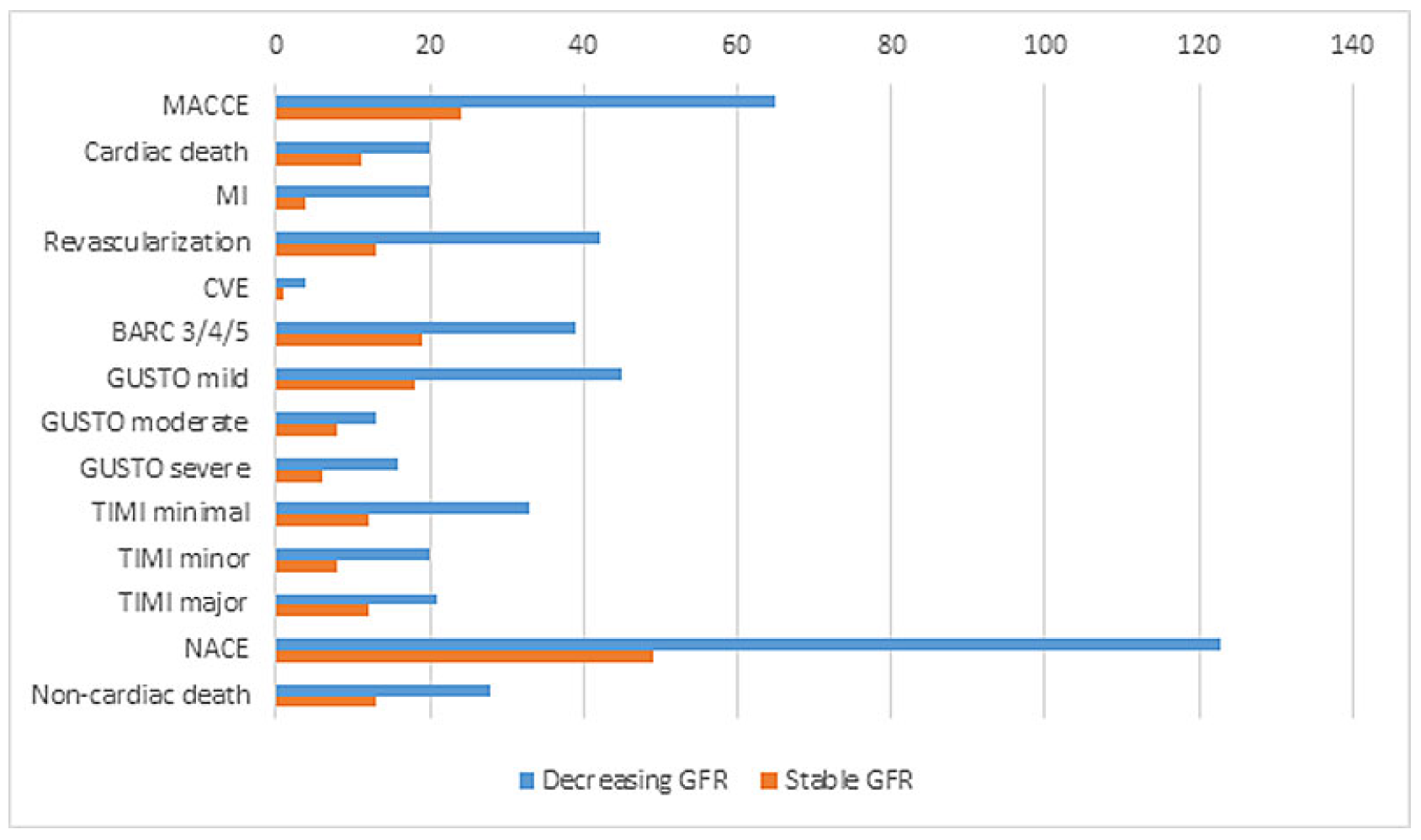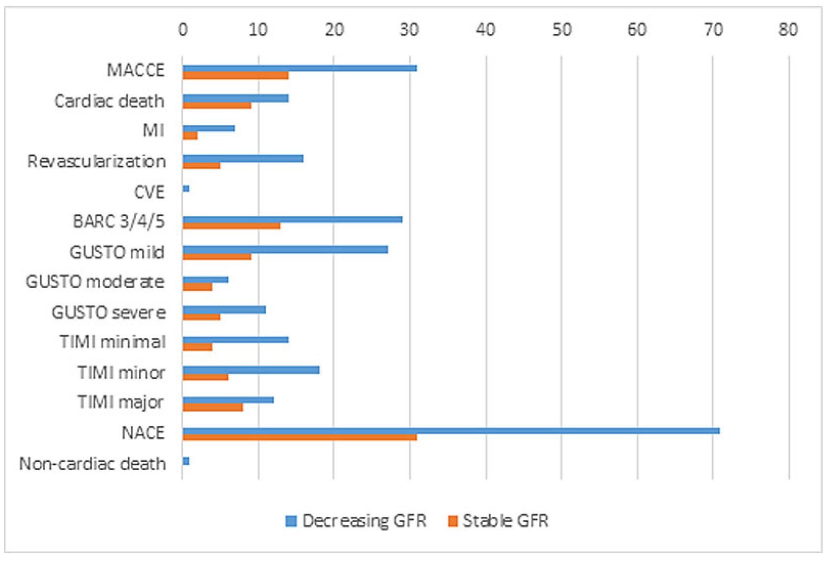 The composite of BARC bleedings was significantly higher in patients with decreasing GFR (7.3% [n = 13] vs 2.9% [n = 16], p = 0.02). There was one noncardiac death within the study population, which occurred in the decreasing GFR group. Similarly, there were significantly more moderate GUSTO and major TIMI bleedings in the decreasing GFR group. Also, significantly more NACE events occurred in patients with AKI compared with the group with stable kidney function (17.3% [n = 31] vs 7.3% [n = 40], p <0.00;