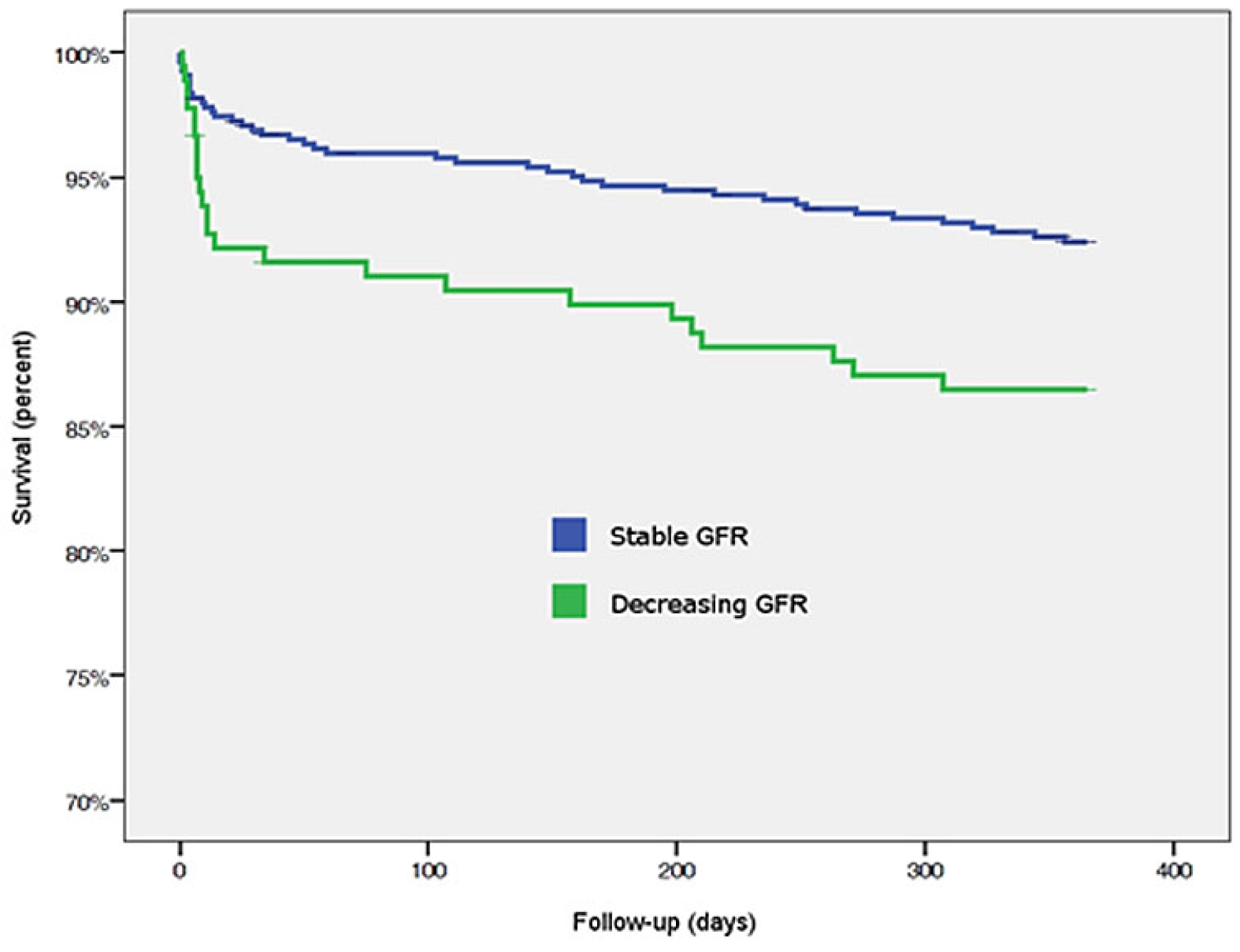 Up to 1 year, MACCE occurred in 9% (n = 65) of the patients, and significantly more often in patients with decreasing GFR (13.4%, n = 24) compared to those with stable GFR (7.5%, n = 41, p = 0.02). Again, higher MACCE rates were mainly attributable to cardiac death.