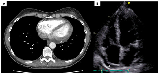 A. Computed tomography of the chest and B. echocardiography showing pericardial effusion (*).