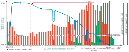 The population of people living with heart failure can be divided into two subgroups. First, those usually treated in specialised cardiology centres, i.e. younger people who commonly undergo coronary and valve interventions and CIED implantation. In this group, in the case of disease progression, heart transplantation or implantation of mechanical circulatory support can be considered as a treatment option. The second group, which is older and much larger, is usually treated by general practitioners and is often hospitalised in general internal disease departments in the case of acute decompensation of their heart failure. This group is often not seen in specialised cardiology centres on a regular basis. People from this group suffer and die more frequently from concomitant disease [2]. The symptom burden and need for medical support differ substantially between these subpopulations. For some proportion of people from both groups, the provision of palliative care could substantially improve their quality of life when added to optimal cardiological care [3,4,5,6].