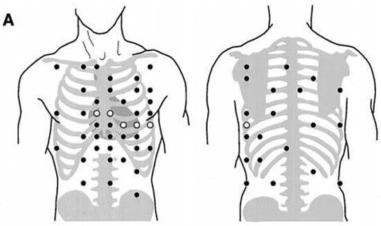 A high-resolution 65-lead body-surface ECG was recorded for each patient with a computer-based recording and analysis system (Biosemi V.O.F., The Netherlands) [9,10]. In total, 14 vertical self-adhesive straps with 65 unipolar electrodes were placed on the patient’s torso as shown in Figure 1, starting from the vertebral column with the patient in the sitting position. The other electrodes were added with the patient lying down in a recumbent position. Four electrodes were placed on the extremities according to Einthoven. The electrodes D5, E5, F6, G6, H6 and I6 were placed according to Wilson’s leads (where electrode “D5” was equivalent to Wilson's “V1”), as previously described [10].