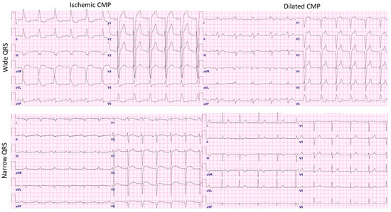 Examples of 12-lead surface ECGs of the four groups: patients with ischaemic cardiomyopathy and narrow a QRS <120 ms (nICMP); patients with ischaemic cardiomyopathy and a wide QRS >120 ms (wICMP); patients with nonischaemic cardiomyopathy and a narrow QRS <120 ms (nDCMP); and patients with nonischaemic cardiomyopathy and a wide QRS >120 ms (wDCMP).