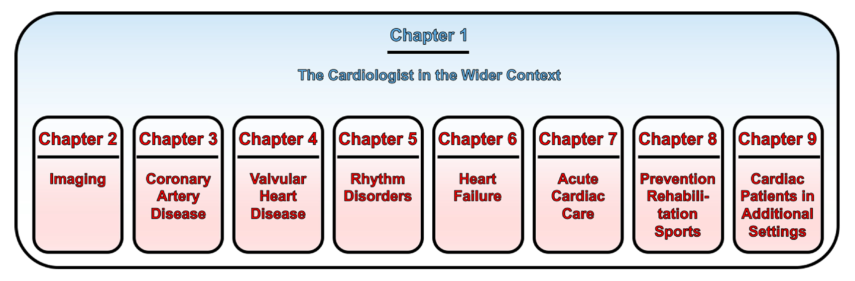The ESC core curriculum consists of nine chapters. Chapters 2 to 9 each cover a major topic of current cardiology, whereas chapter 1 has a more general content. It is devoted to the cardiologist in the wider context and blends into all the other chapters because it defines the different professional roles a cardiologist should be able to adopt in clinical practice. These professional roles have been defined by the Canadian Medical Society in the CanMEDS Physician Competency Framework, which has been adopted by the ESC in the new core curriculum [
