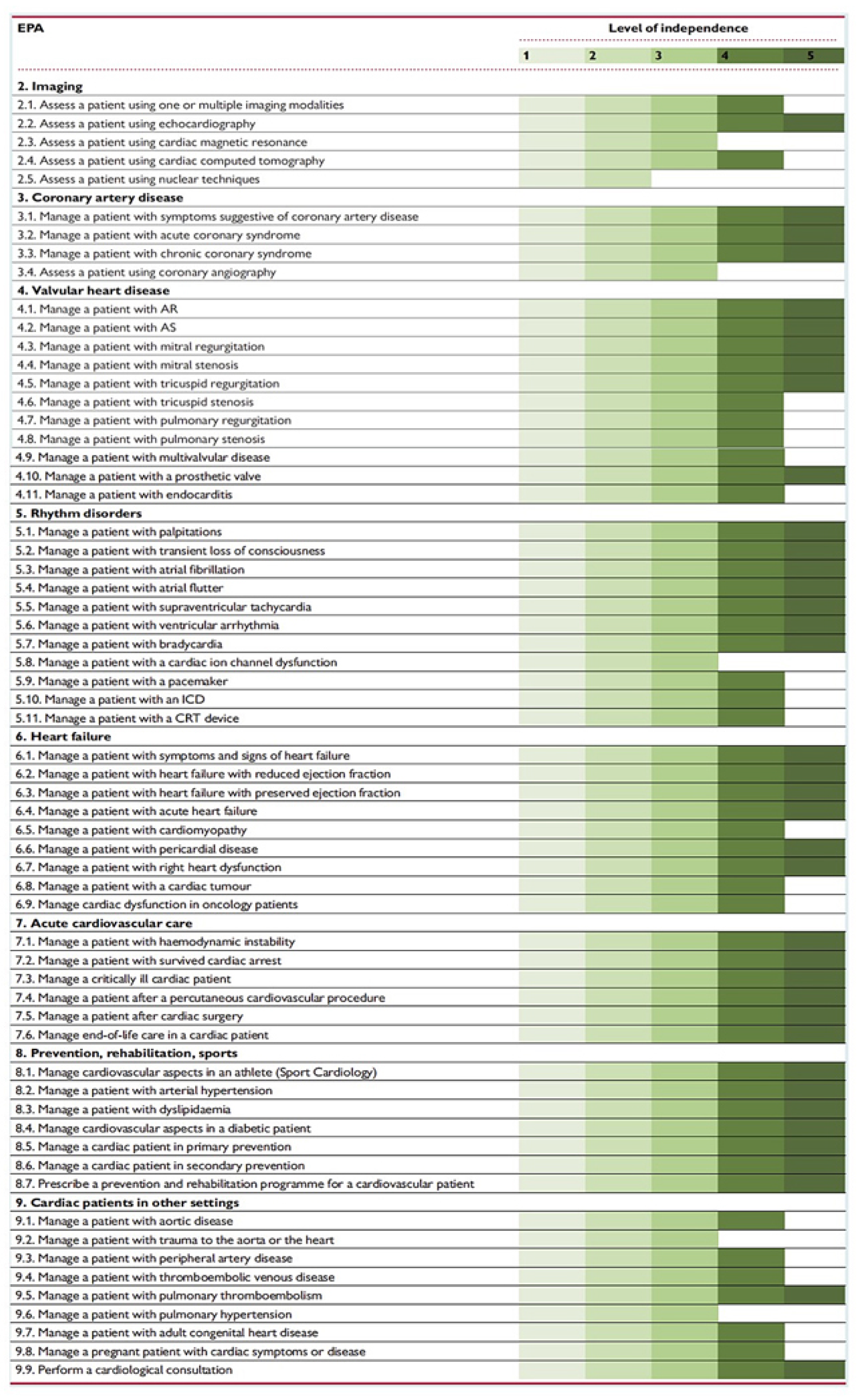 The core curriculum contains a total of 62 EPAs distributed over chapters 2 to 9. These EPAs define the competencies the general cardiologist without subspecialisation should acquire during training in order to work as an independent professional in clinical practice. It is essential that not all of these professional activities need to be mastered at the same level of independence; the levels rather represent the current activities of the general cardiologist and are an important instrument for defining the profession of the general cardiologist as opposed to that of the subspecialised cardiologist. Therefore, the independence level is indicated for each EPA as it is appropriate for the clinical activities of the general cardiologist (