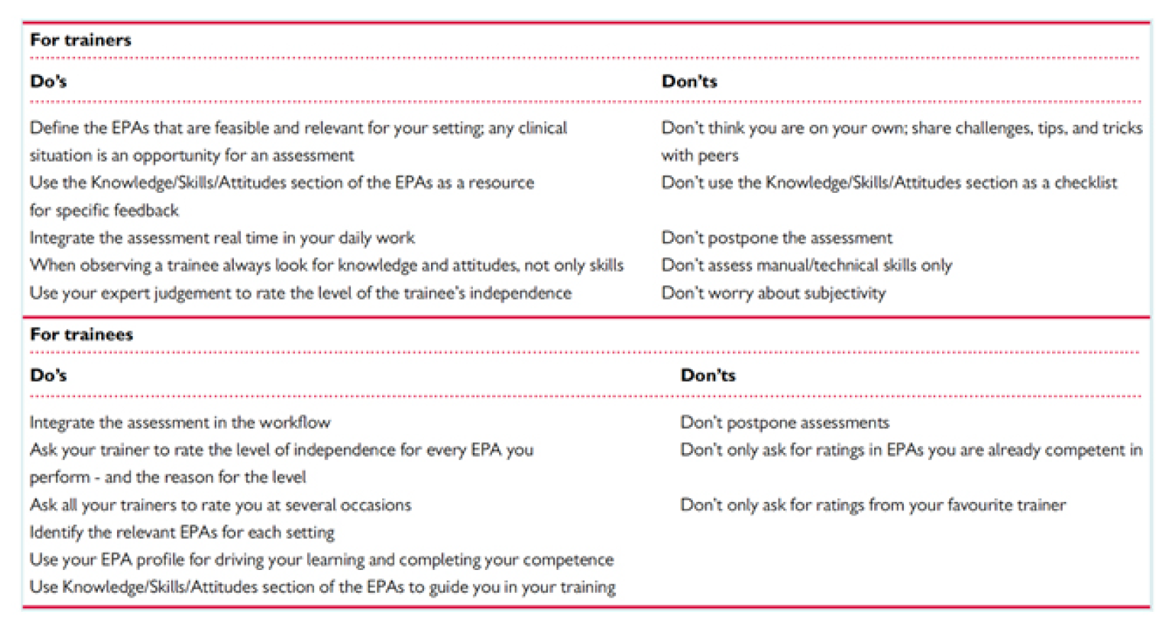 Application of EPAs in a training programme is expected to increase the awareness of both trainee and trainer of the current status and specific needs of the trainee [