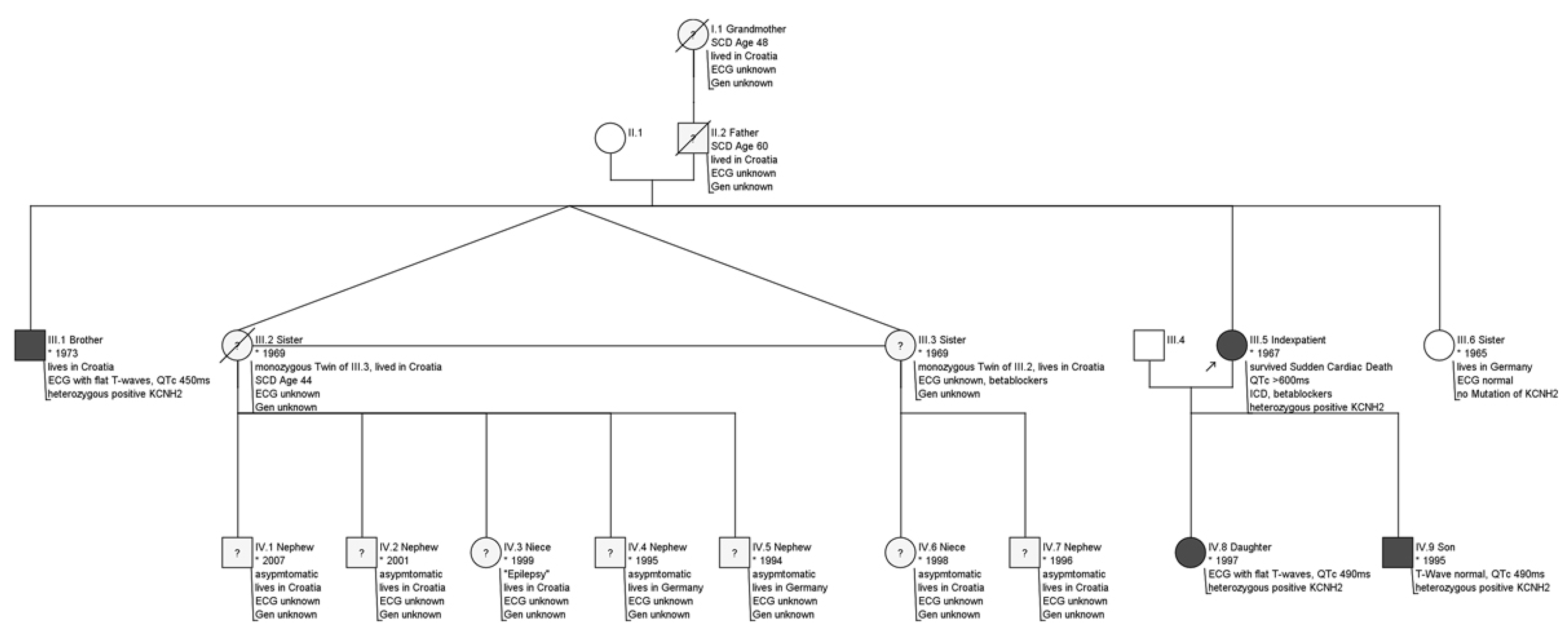 Sowohl die Grossmutter väterlicherseits (mit 48 Jahren) als auch der Vater (mit 60 Jahren) der Patientin sind ungeklärt in Kroatien verstorben. Kurz vor der Hospitalisation unserer Indexpatientin starb auch eine Schwester (III.2) mit 44 Jahren plötzlich (