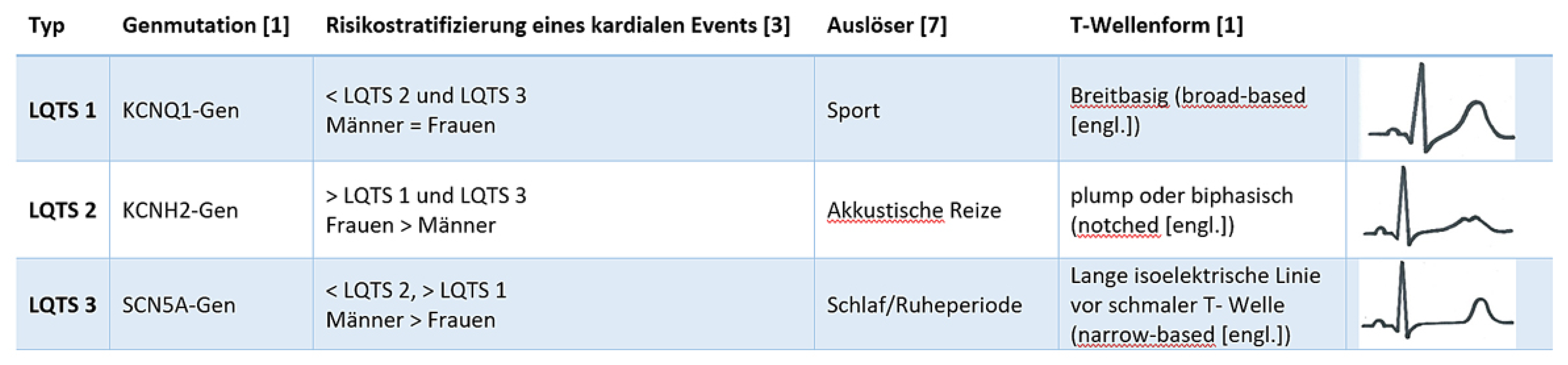 Klinisch gilt es zu beachten, dass nicht nur eine Verlängerung der QTc-Zeit für die Manifestation eines LQTS spricht, sondern häufig auch Veränderungen in der Morphologie der T-Welle zu beobachten sind: Beim LQTS1 präsentiert sich die T-Welle breitbasig (engl. «broadbased»), beim LQTS2 plump oder biphasisch (engl. «notched») und beim LQTS3 zeigt sich eine lange isoelektrische Linie vor der schmalen T-Welle (engl. «narrowbased») (Tabelle 1) [