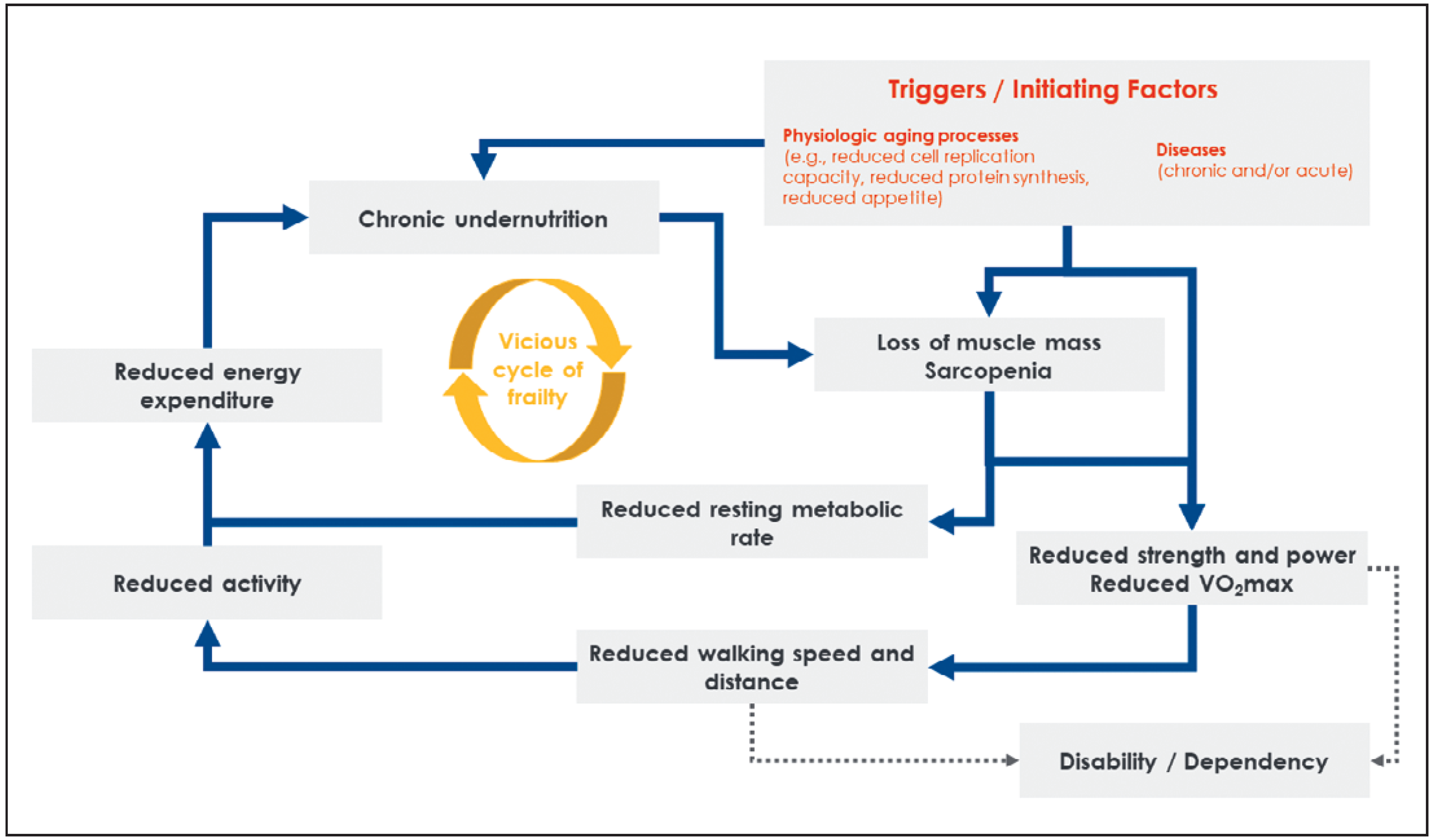 - Frailty is a pathophysiological vicious cycle based on chronic undernutrition and loss of muscle mass, leading to disability and care dependency if the cycle is not interrupted.