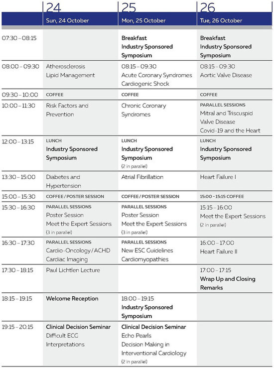 The three-day programme will provide an up-to-date overview of current diagnosis and management, from prevention to intervention, from arrhythmias to valvular heart disease, and from acute coronary syndromes to heart failure (Figure 2). A particular focus will be the various new ESC Practice Guidelines presented by their chairs. The educational objectives are to review and disseminate the latest knowledge about advances in prevention, diagnosis and treatment of cardiovascular disease. The course includes state-of-the-art lectures, interactive case presentations and clinical decision-making seminars, live-in-a-box cases and “Meet-the-Expert” sessions.