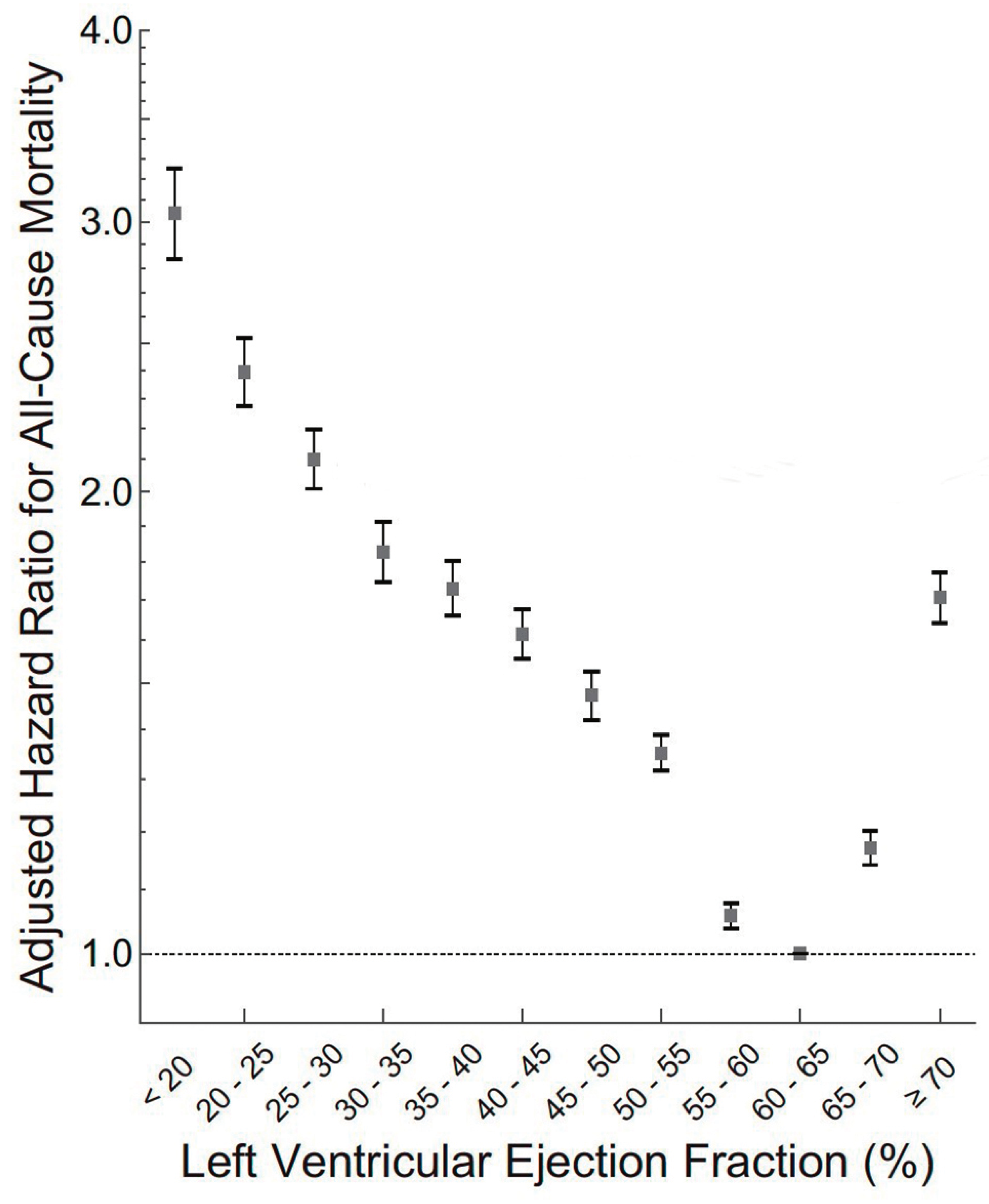 - Wehner, G.J.; Jing, L.; Haggerty, C.M.; Suever, J.D.; Leader, J.B.; Hartzel, D.N.; et al. Routinely reported ejection fraction and mortality in clinical practice: where does the nadir of risk lie? Eur Heart J. 2020, 41, 1249–1257. [Google Scholar] [CrossRef] [PubMed]