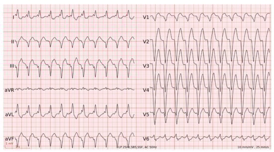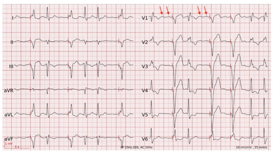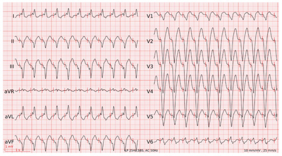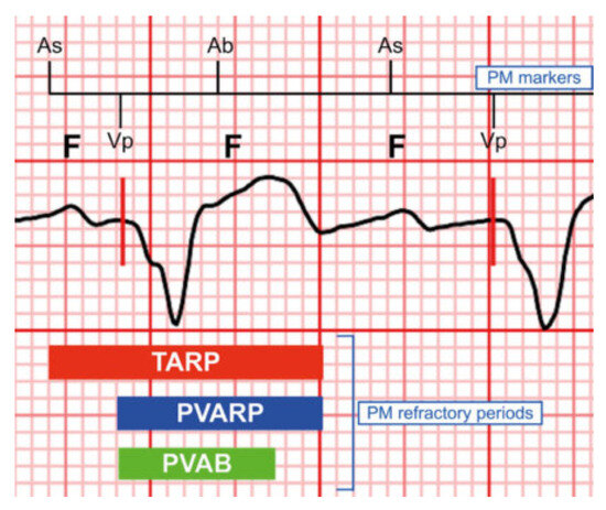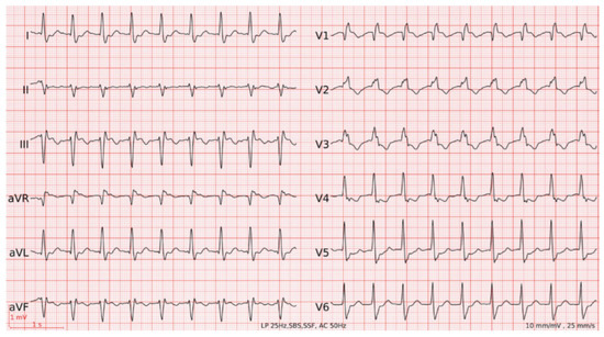 A 90-year-old man with ischaemic heart disease with preserved ejection fraction, paroxysmal atrial flutter and sinus sick syndrome requiring dual-chamber pacemaker implantation 2 years earlier (Sorin KORA 250 DR, atrial lead VEGA R52, ventricular lead VEGA R58; stimulation mode AAIR-DDDR, lower rate limit [...] Read more.