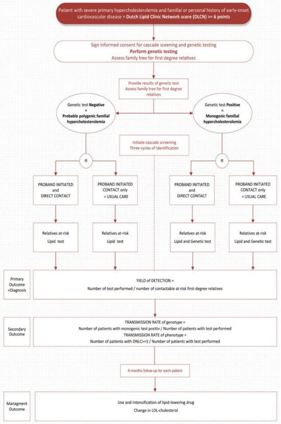 The CATCH study offers genetic testing for patients with severe hypercholesterolaemia and a familial or personal history of early-onset CVD with a Dutch Lipid Clinic Network score (DLNC) ≥6 points. Patients are separated into two groups before randomisation based on the result of the genetic test, either positive for a mongenic mutation in one of the three genes causing FH (monogenic FH group), or negative for the monogenic mutation (polygenic FH group). The presence or absence of a monogenic mutation in the index case will determine the screening test used for cascade screening of relatives, either with a genetic or with a lipid test.