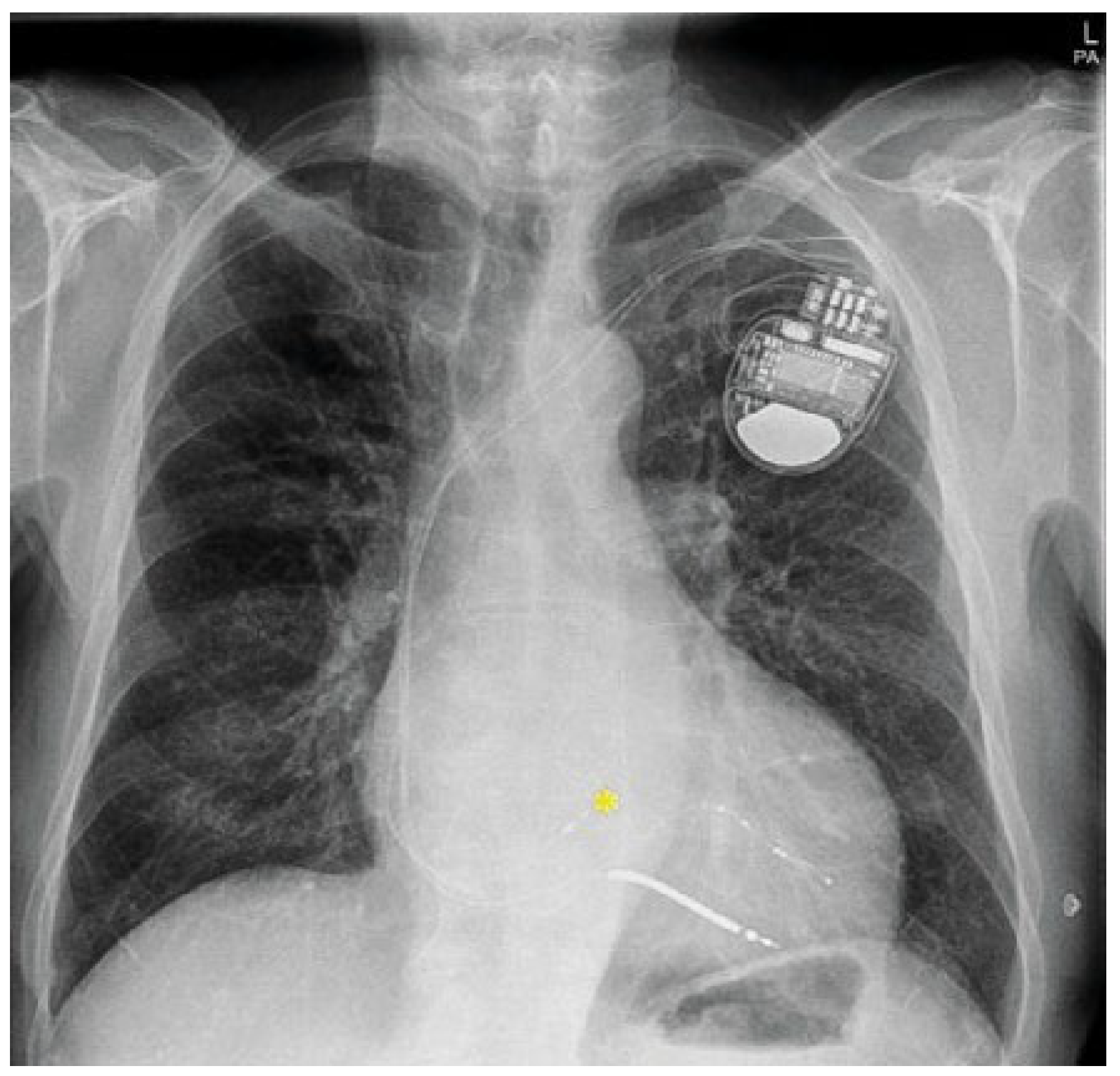 Via a left subclavian venous access, a right ventricular shock lead (Medtronic, Sprint Quattro Secure S MRI SureScan 6935M62 cm) as well as a quadripolar left ventricular lead (Medtronic, Attain Stability 88 cm) were implanted. The latter was successfully positioned in a posterolateral coronary sinus side branch (