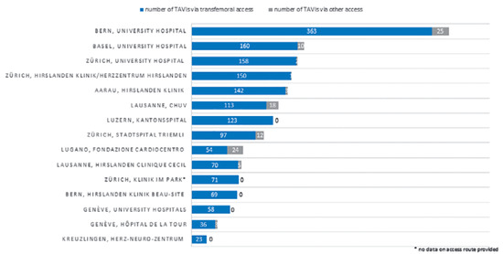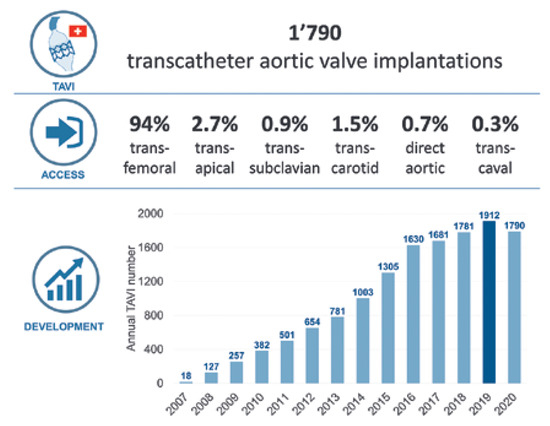Figure 4). In 2020, 1790 TAVIs were performed with femoral access being used in 94% and trans-apical access in 2.7% of all implantations (