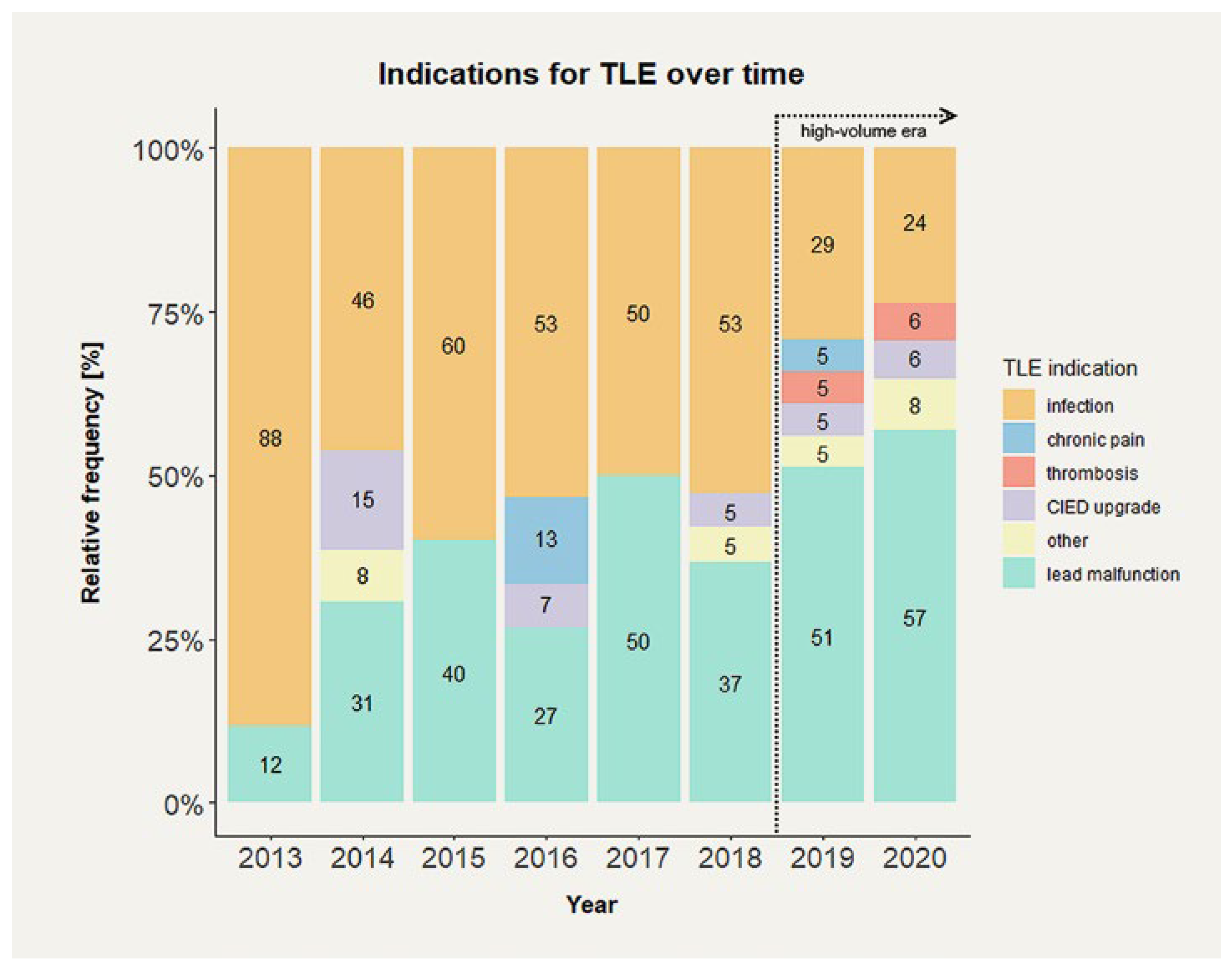 - The relative frequency of noninfectious TLE indications is increasing. This is likely attributable to a significant rate of lead failures [4], a more liberal extraction policy with increasing experience, favourable outcomes and evolution of our institution into a high-volume TLE centre.