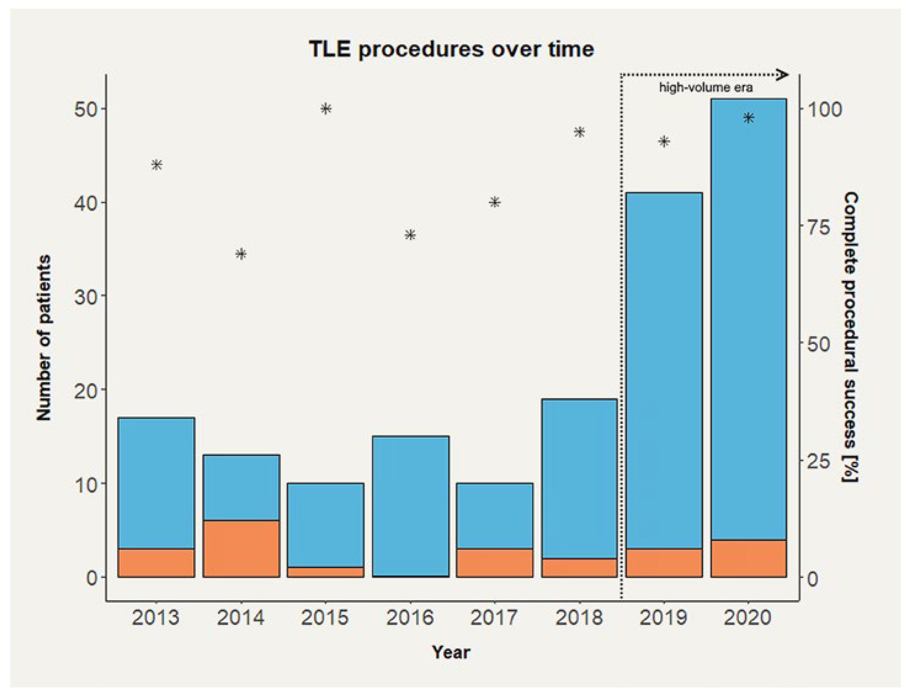 - Besides the temporal change of TLE indications, patients undergoing TLE seem to exhibit similar characteristics over time and compared with large multicentre registries [5]. However, TLE success rates significantly increase with the increasing use of rotational mechanical sheaths.