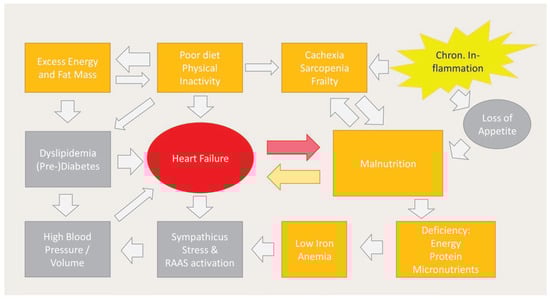 Connection between nutritional status and heart failure. RAAS: renin–angiotensin–aldosterone system; yellow: directly diet-related.