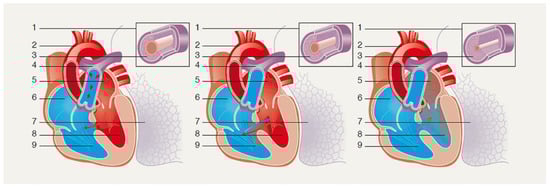 Evolution of a systemic-to-pulmonary shunt towards Eisenmenger syndrome. 1. Pulmonary arteriole. 2. aorta. 3. Media. 4. Pulmonary artery. 5. left atrium. 6. right atrium. 7. lung. 8. left ventricle. 9. right ventricle. Reproduced with permission from [6].