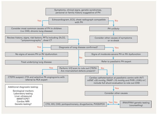 Diagnostic algorithm for pulmonary hypertension in children. AVT: acute vasodilator testing; CHD: congenital heart disease; CPET: cardiopulmonary exercise test; CTA: CT angiography; CTEPH: chronic thromboembolic PH; CTD: connective tissue disease; DLCO: diffusing capacity of the lung to carbon monoxide; FPAH: familial PAH; PAWP: pulmonary arterial wedge pressure; PCH: pulmonary capillary haemangiomatosis; PEA: pulmonary endarterectomy; PFT: pulmonary function test; PVOD: pulmonary venoocclusive disease; RV: right ventricle; V/Q: ventilation/perfusion; 6MWT: 6-minute walk test. reproduced with permission from [2].