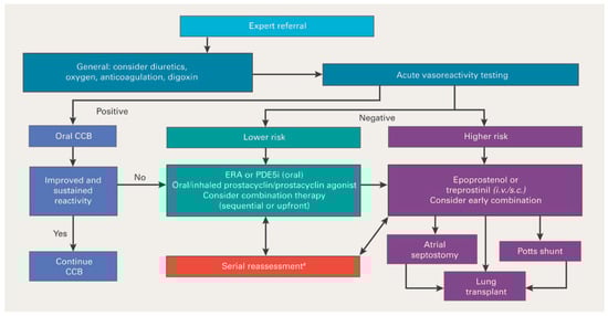 Paediatric idiopathic/familial pulmonary arterial hypertension treatment algorithm. CCB: calcium channel blocker; ERA: endothelin receptor antagonist; PDE5I: phosphodiesterase type 5 inhibitor. #: deterioration or not meeting treatment goals. Reproduced with permission from [2].