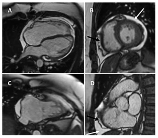 CMR steady-state free precession cine still frames. (A) Four chamber view enddiastolic; (B) midventricular short axis; (C) RV 2-chamber view; (D) Right ventricular outflow tract with circular pericardial effusion (white arrow) and epicardial fat (black arrow).