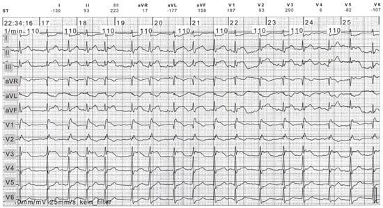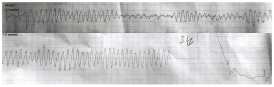 Upon arrival, the rescuers witnessed the patient’s collapse. In absence of a palpable pulse a cardiopulmonary resuscitation (CPR) was initiated. On the monitor a ventricular fibrillation (VF) was detected (Figure 1). A first defibrillation reestablished a return to spontaneous circulation (ROSC) within a few minutes. The electrocardiogram (ECG) revealed a rapid atrial fibrillation (AF) with right bundle branch block (RBBB) and ST-segment elevation in the inferior leads (Figure 2). The patient experienced another VF requiring a second and a third defibrillation. The EMS was able to achieve a ROSC with hemodynamic stability and restoration of consciousness with a Glasgow Coma Scale of 14.