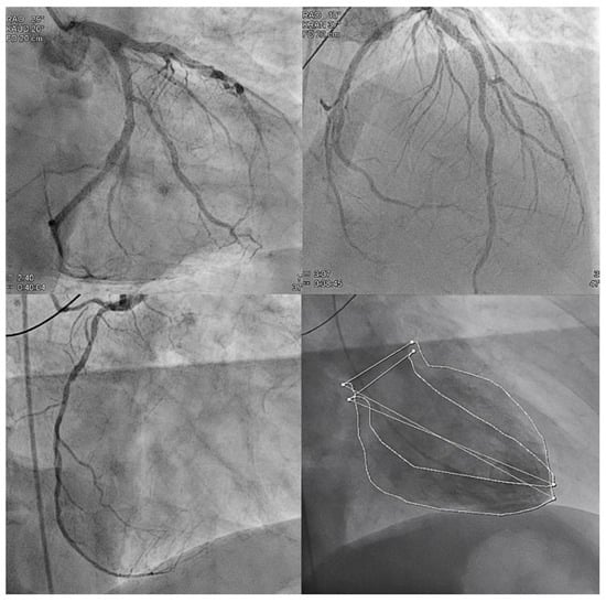 Angiograms of the left and right coronary arteries showing patent vessels and stents. Bottom left ventriculography showing normal left ventricular ejection fraction without regional wall motion abnormalities.